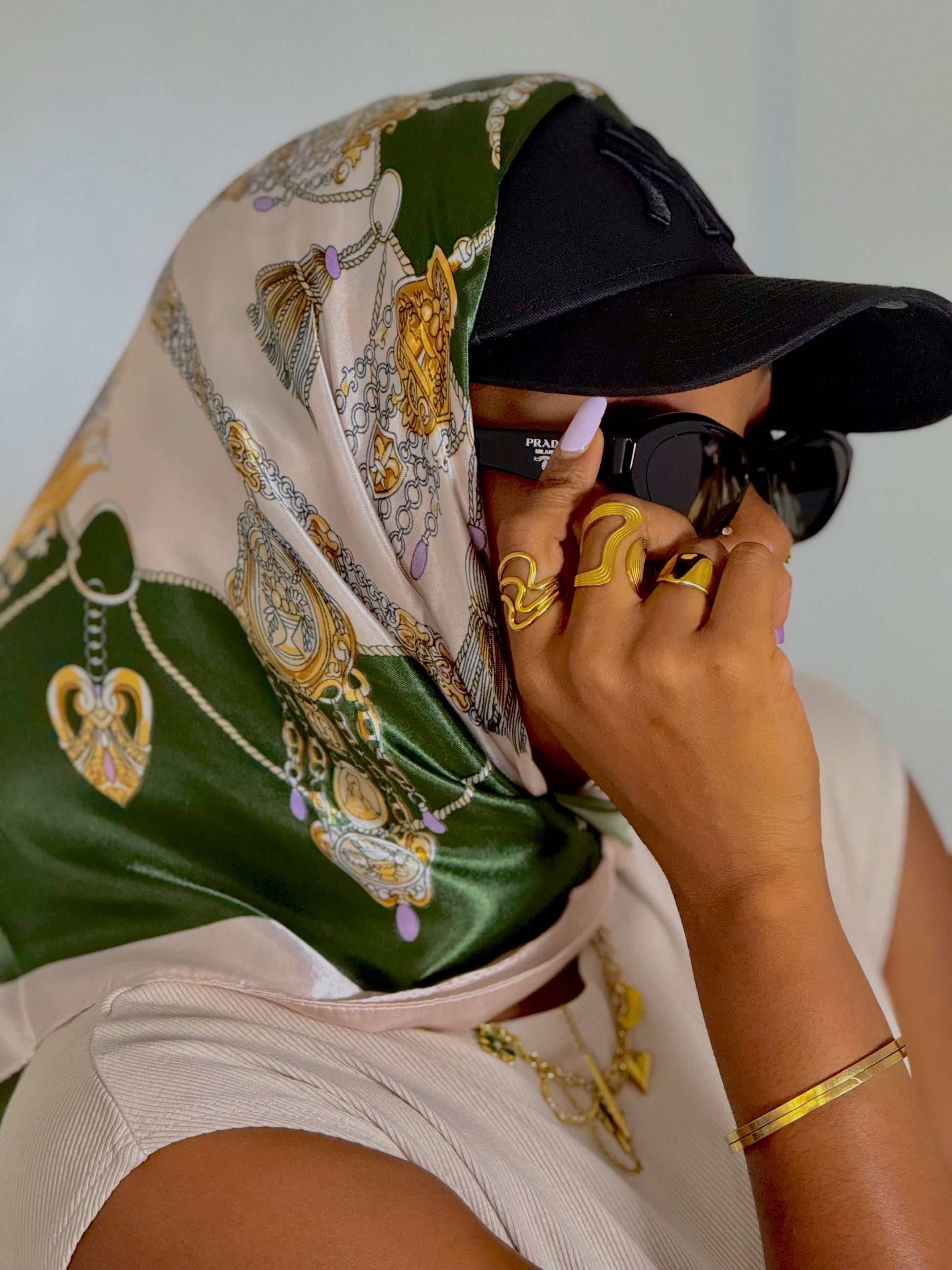 Foulard habiller 90x90 cm, vert avec motif vintage.